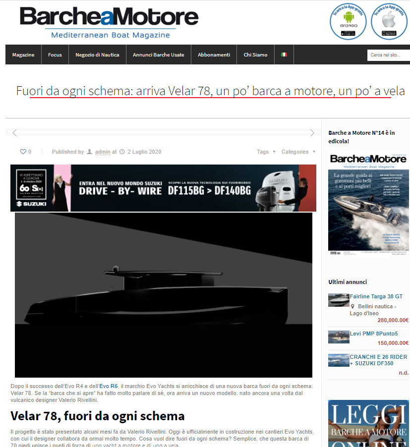 After the success of the Evo R4 and Evo R6, the Evo Yachts brand is enriched with a new boat out of every scheme: Velar 78. If the “boat that opens” has made a lot of talk about it, now comes a new model, born once again by the volcanic designer Valerio Rivellini.