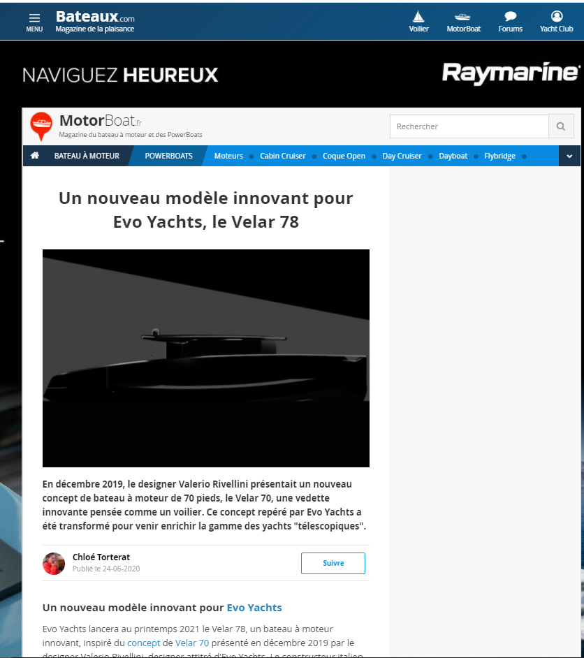 In December 2019, designer Valerio Rivellini presented a new 70-foot motorboat concept, the Velar 70, an innovative yacht designed like a sailboat. This concept identified by Evo Yachts has been transformed to enrich the range of “telescopic” yachts.