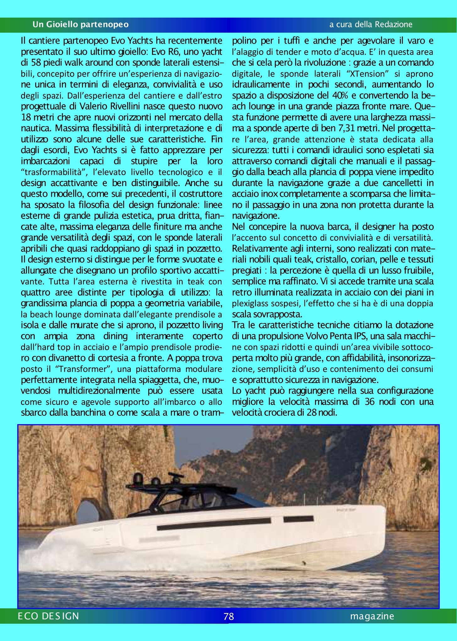 The Neapolitan shipyard Evo Yachts recently presented its latest jewel: Evo R6, a 58-foot walk around yacht with extendable side rails, designed to offer a unique sailing experience in terms of elegance, conviviality and use of space